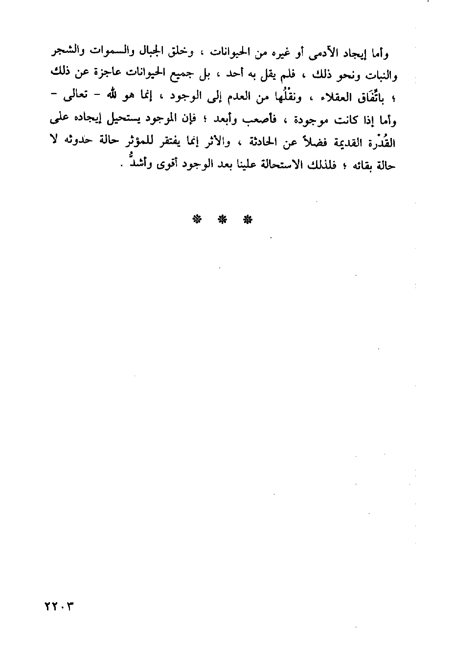 وأما إيجاد الآدمي أو غيره من الحيوانات، وخلق الجبال والسموات والشجر والنبات ونحو ذلك، فلم يقل به أحد، بل جميع الحيوانات عاجزة عن ذلك؛ باتفاق العقلاء، ونقلها من العدم إلى الوجود، إنما هو لله - تعالى - وأما إذا كانت موجودة، فأصعب وأبعد؛ فإن الموجود يستحيل إيجاده على القدرة القديمة فضلاً عن الحادثة، والأثر إنما يفتقر للمؤثر حالة حدوثه لا حالة بقائه؛ فلذلك الاستحالة علينا بعد الوجود أقوى وأشد.