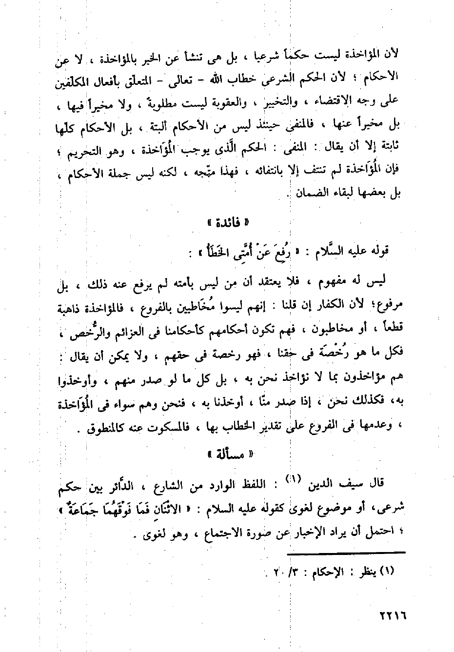 لأن المؤاخذة ليست حكمًا شرعيًا، بل هي تنشأ عن الخبر بالمؤاخذة، لا عن الأحكام؛ لأن الحكم الشرعي خطاب الله - تعالى - المتعلق بأفعال المكلفين على وجه الاقتضاء، والتخيير، والعقوبة ليست مطلوبة، ولا مخيرًا فيها، بل مخيرًا عنها، فالمنفى حينئذ ليس من الأحكام ألبتة، بل الأحكام كلها ثابتة إلا أن يقال: المنفى: الحكم الذي يوجب المؤاخذة، وهو التحريم؛ فإن المؤاخذة لم تنتف إلا بانتفائه، فهذا متجه، لكنه ليس جملة الأحكام، بل بعضها لبقاء الضمان.