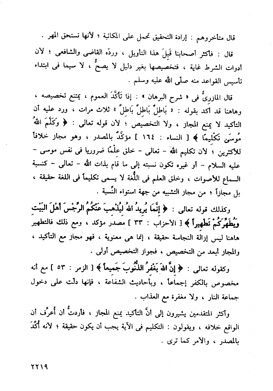 وكذلك قوله تعالى: {إنما يريد الله ليذهب عنكم الرجس أهل البيت ويطهركم تطهيرا} [الأحزاب: 33] مصدر مؤكد، ومع ذلك فالتطهير هاهنا ليس إزالة النجاسة حقيقة، إنما هي معنوية، فهو مجاز مع التأكيد، والمجاز أبعد من التخصيص، فجواز التخصيص أولى.
