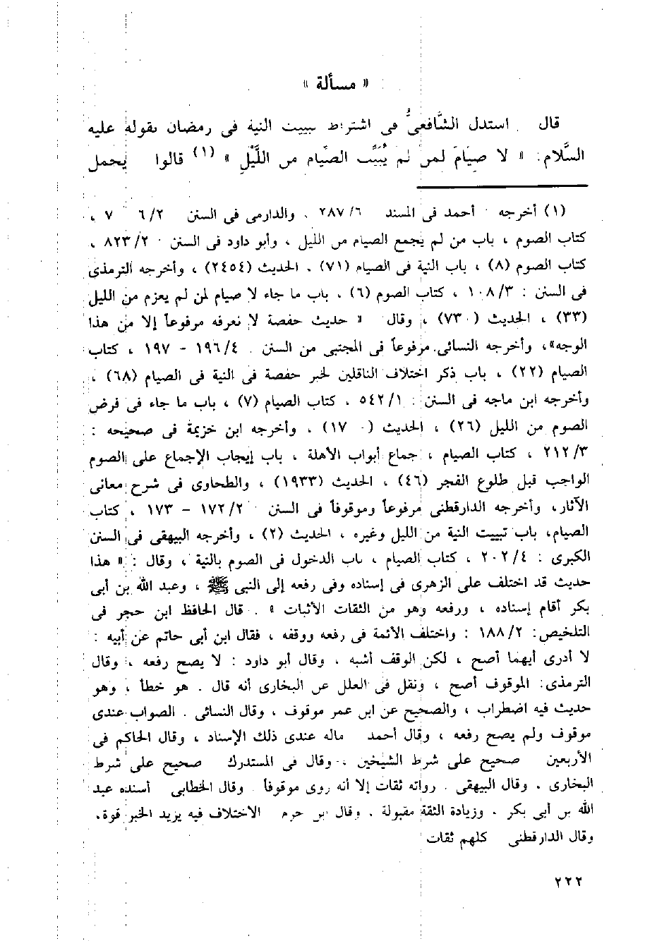 قال: استدل الشافعي في اشتراط تبييت النية في رمضان لقوله عليه السلام: (لا صيام لمن لم يبيت الصيام من الليل) قالوا: يحمل