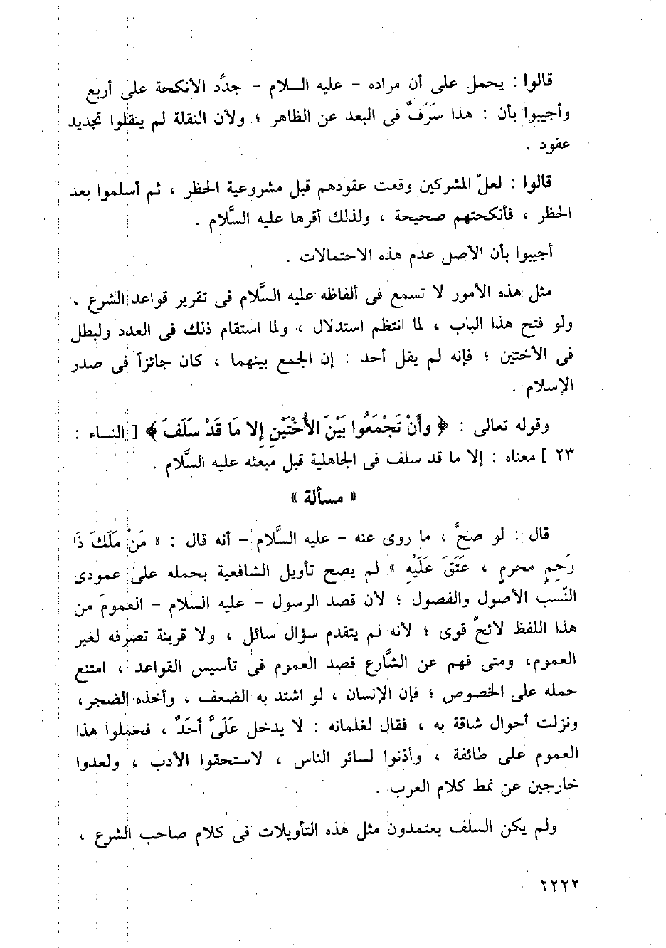 مثل هذه الأمور لا تسمع في ألفاظه عليه السلام في تقرير قواعد الشرع، ولو فتح هذا الباب، لما انتظم استدلال، ولما استقام ذلك في العدد ولبطل في الأختين؛ فإنه لم يقل أحد: إن الجمع بينهما، كان جائزًا في صدر الإسلام.