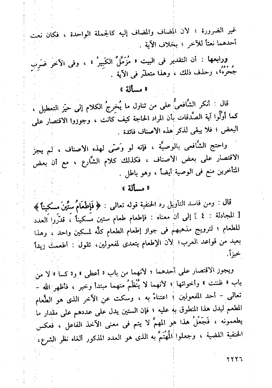 قال: ومن فاسد التأويل رد الحنفية قوله تعال: {فإطعام ستين مسكينًا} [المجادلة: 4] إلى أن معناه: فإطعام طعام ستين مسكينًا، قدروا العدد للطعام؛ لترويج مذهبهم في جواز إطعام الطعام كله لمسكين واحد، وهذا بعيد من قواعد العرب؛ لأن الإطعام يتعدى لمفعولين، تقول: أطعمت زيدًا خبزًا.