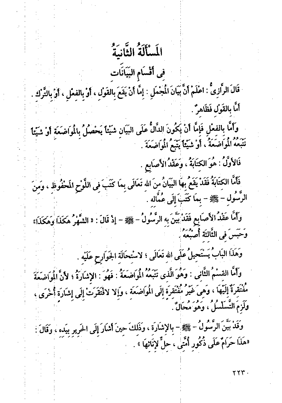 وقد بين الرسول - صلى الله عليه وسلم - بالإشارة، وذلك حين أشار إلى الحرير بيده، وقال: (هذا حرام على ذكور أمتي، حل لإناثها).