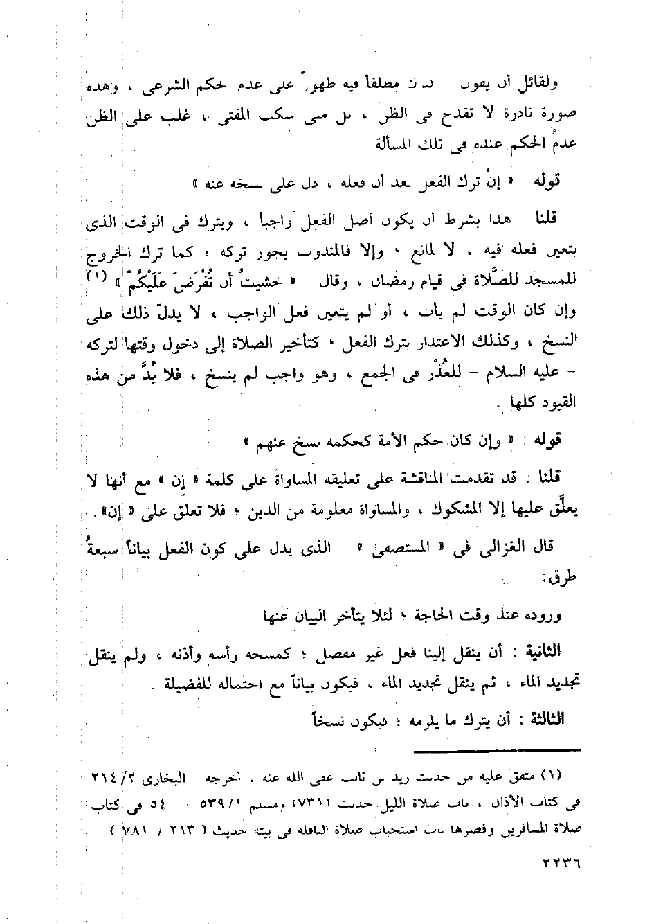 قلنا: هذا بشرط أن يكون أصل الفعل واجبًا، ويترك في الوقت الذي يتعين فعله فيه، لا لمانع؛ وإلا فالمندوب يجوز تركه؛ كما ترك الخروج للمسجد للصلاة في قيام رمضان، وقال: (خشيت أن تفرض عليكم) وإن كان الوقت لم يأت، أو لم يتعين فعل الواجب، لا يدل ذلك على النسخ، وكذلك الاعتذار بترك الفعل، كتأخير الصلاة إلى دخول وقتها لتركه - عليه السلام - للعذر في الجمع، وهو واجب لم ينسخ، فلا بد من هذه القيود كلها.