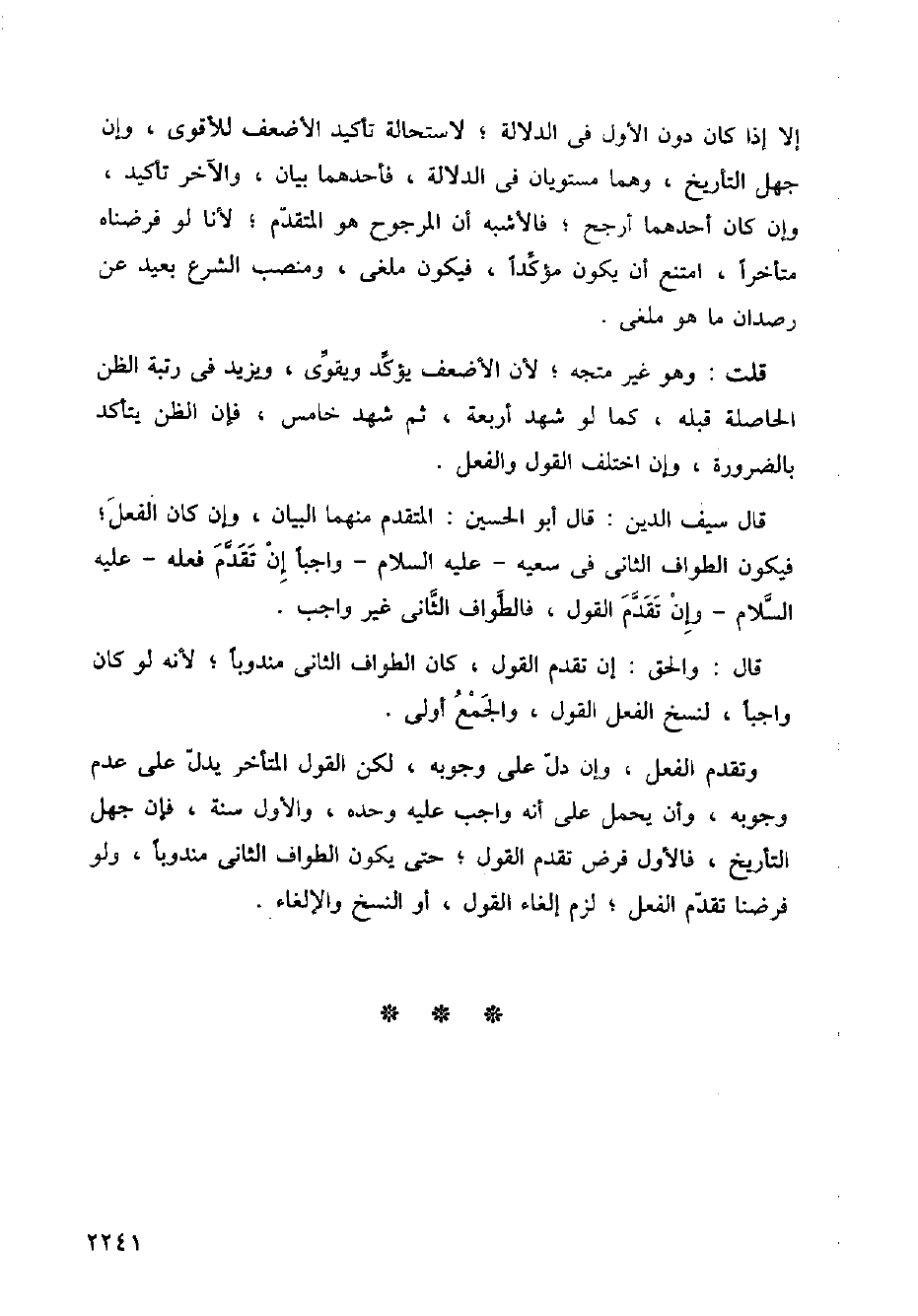 قال سيف الدين: قال أبو الحسين: المتقدم منهما البيان، وإن كان الفعل؛ فيكون الطواف الثاني في سعيه - عليه السلام - واجبًا إن تقدم فعله - عليه السلام - وإن تقدم القول، فالطواف الثاني غير واجب.