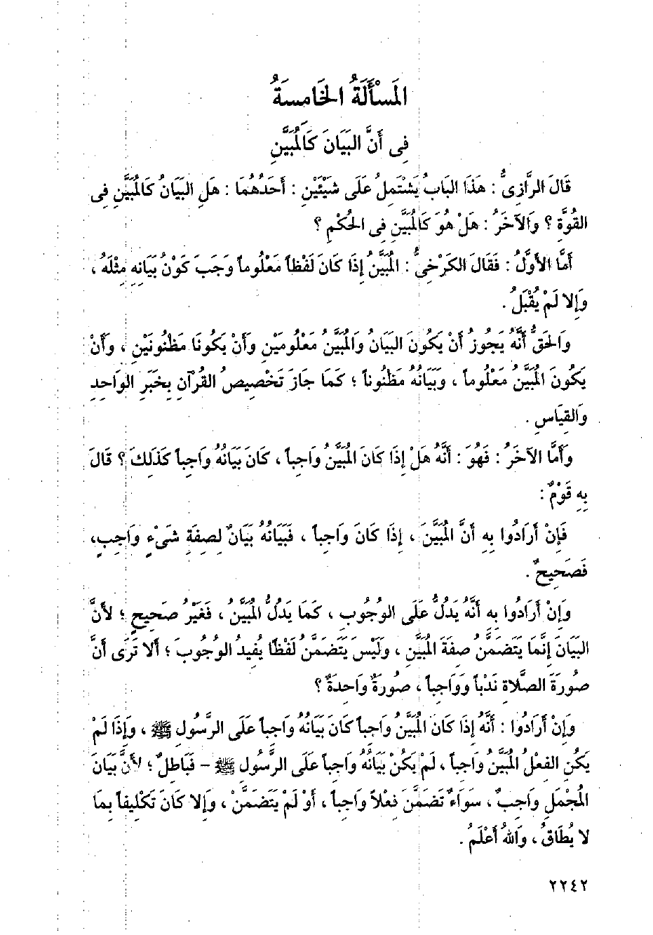 قال الرازي: هذا الباب يشتمل على شيئين: أحدهما: هل البيان كالمبين في القوة؟ والآخر: هل هو كالمبين في الحكم؟