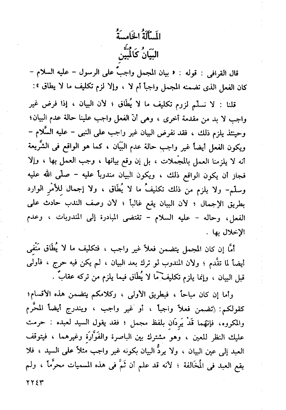 قال القرافي: قوله: (بيان المجمل واجب على الرسول - عليه السلام - كان الفعل الذي تضمنه المجمل واجبًا أم لا، وإلا لزم تكليف ما لا يطاق):