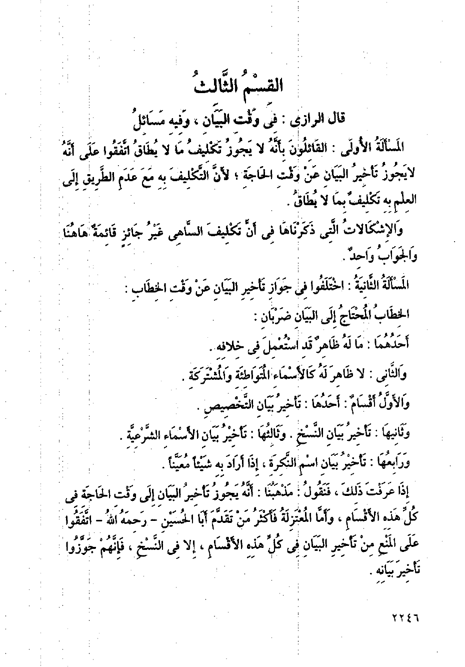 وثانيها: تأخير بيان النسخ. وثالثها: تأخير بيان الأسماء الشرعية.