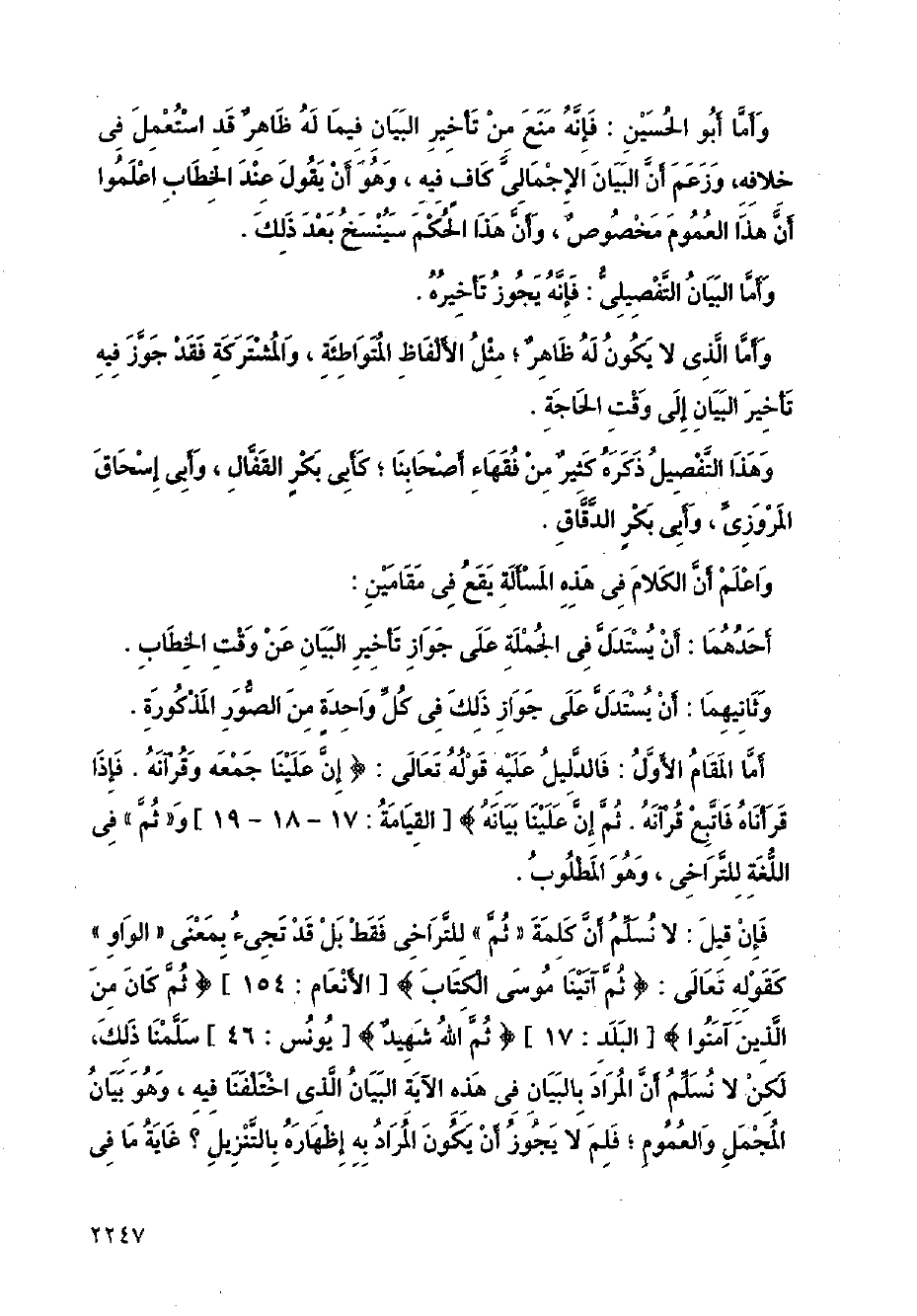أما المقام الأول: فالدليل عليه قوله تعالى: {إن علينا جمعه وقرآنه. فإذا قرأناه فاتبع قرآنه. ثم إن علينا بيانه} [القيامة: 17 - 18 - 19] و (ثم) في اللغة للتراخي، وهو المطلوب.