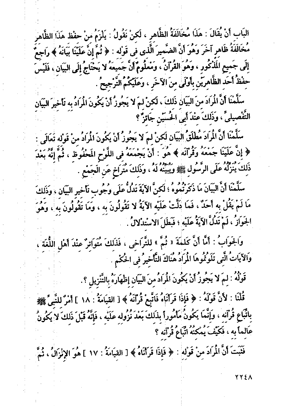 الباب أن يقال: هذا مخالفة الظاهر، لكن نقول: يلزم من حفظ هذا الظاهر مخالفة ظاهر آخر وهو أن الضمير الذي في قوله: {ثم إن علينا بيانه} راجع إلى جميع المذكور، وهو القرآن، ومعلوم أن جميعه لا يحتاج إلى البيان، فليس حفظ أحد الظاهرين بأولى من الآخر، وعليكم الترجيح.