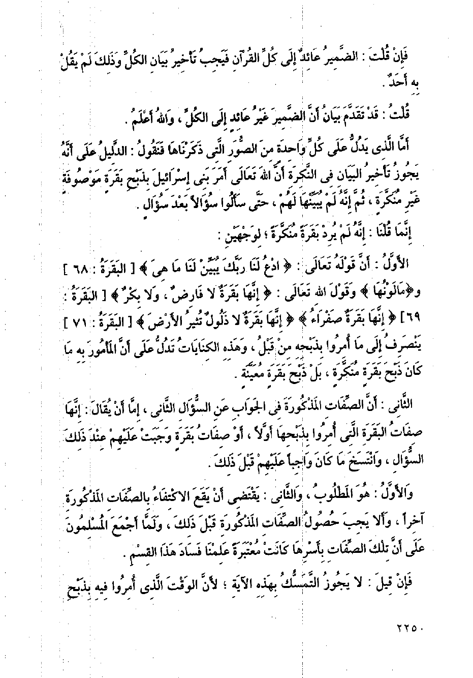 الأول: أن قوله تعالى: {ادع لنا ربك يبين لنا ما هي} [البقرة: 68] و {ما لونها} وقول الله تعالى: {إنها بقرة لا فارض، ولا بكر} [البقرة: 69] {إنها بقرة صفراء} {إنها بقرة لا ذلول تثير الأرض} [البقرة: 71] ينصرف إلى ما أمروا بذبحه من قبل، وهذه الكنايات تدل على أن المأمور به ما كان ذبح بقرة منكرة، بل ذبح بقرة معينة.