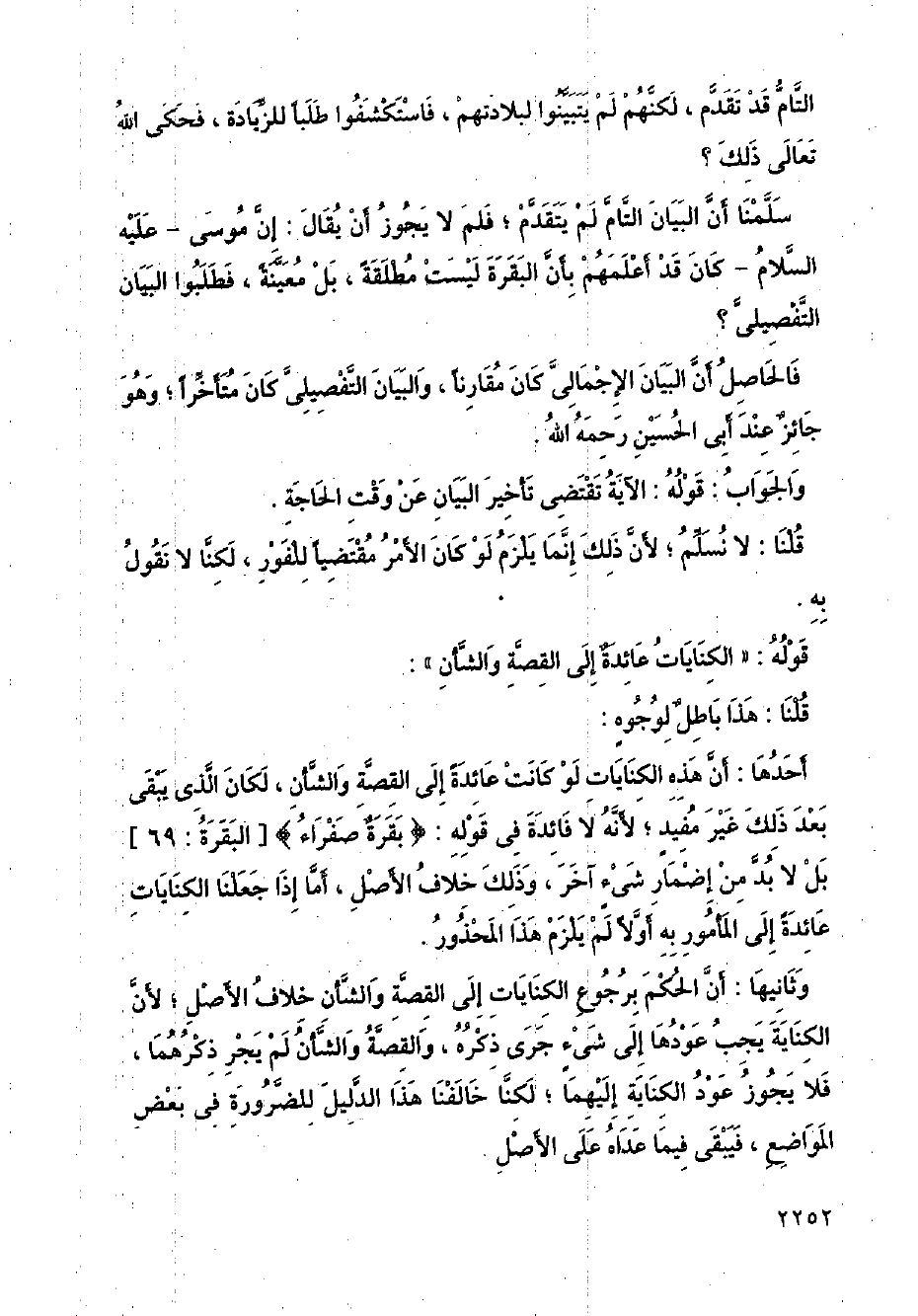 أحدها: أن هذه الكنايات لو كانت عائدة إلى القصة والشأن، لكان الذي يبقى بعد ذلك غير مفيد؛ لأنه لا فائدة في قوله: {بقرة صفراء} [البقرة: 69] بل لابد من إضمار شيء آخر، وذلك خلاف الأصل، أما إذا جعلنا الكنايات عائدة إلى المأمور به أولاً لم يلزم هذه المحذور.