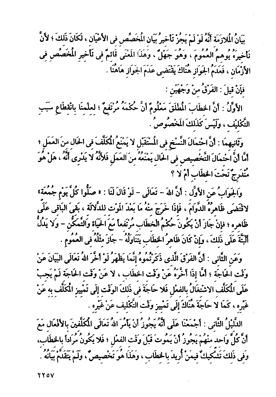 وعن الثاني: أن الفرق الذي ذكرتموه إنما يظهر لو أخر الله تعالى البيان عن وقت الحاجة؛ أما إذا أخره عن وقت الخطاب، لا عن وقت الحاجة لم يجب على المكلف الاشتغال بالفعل فلا حاجة في ذلك الوقت إلى تمييز المكلف به عن غيره، كما لا حاجة هناك إلى تمييز وقت التكليف عن غيره.