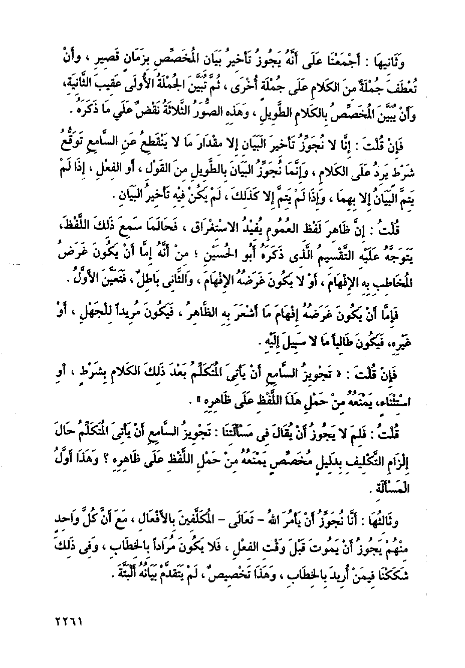 وثانيها: أجمعنا على أن يجوز تأخير بيان المخصص بزمان قصير، وأن تعطف جملة من الكلام على جملة أخرى، ثم تبين الجملة الأولى عقيب الثانية، وأن يبين المخصص بالكلام الطويل، وهذه الصور الثلاثة نقض على ما ذكره.