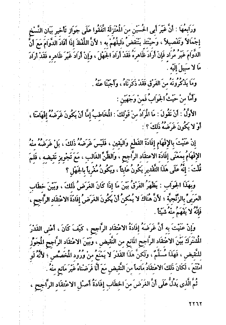 ورابعها: أن غير أبي الحسين من المعتزلة اتفقوا على جواز تأخير بيان النسخ إجمالاً وتفصيلاً، وحينئذ ينتقض دليلهم به؛ لأن اللفظ إذا أفاد الدوام مع أن الدوام غير مراد فإن أراد ظاهره فقد أراد الجهل، وإن أراد غير ظاهره فقد أراد ما لا سبيل إليه.