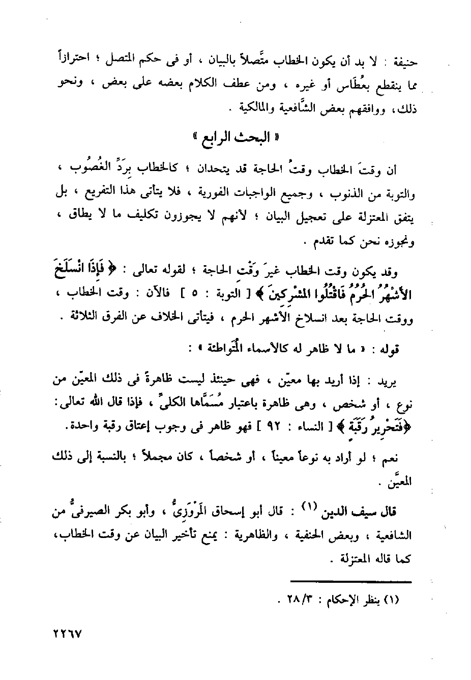 قال سيف الدين: قال أبو إسحاق المروزي، وأبو بكر الصيرفي من الشافعية، وبعض الحنفية، والظاهرية: يمنع تأخير البيان عن وقت الخطاب، كما قاله المعتزلة.