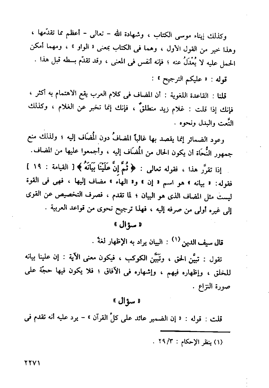 إذا تقرر هذا، فقوله تعالى: {ثم إن علينا بيانه} [القيامة: 19] فقوله: (بيانه) هو اسم (إن) و (الهاء) مضاف إليها، فهي في القوة ليست مثل المضاف الذي هو البيان؛ لما تقدم، فصرف التخصيص عن القوى إلى غيره أولى من صرفه إليه، فهذا ترجيح نحوي من قواعد العربية.