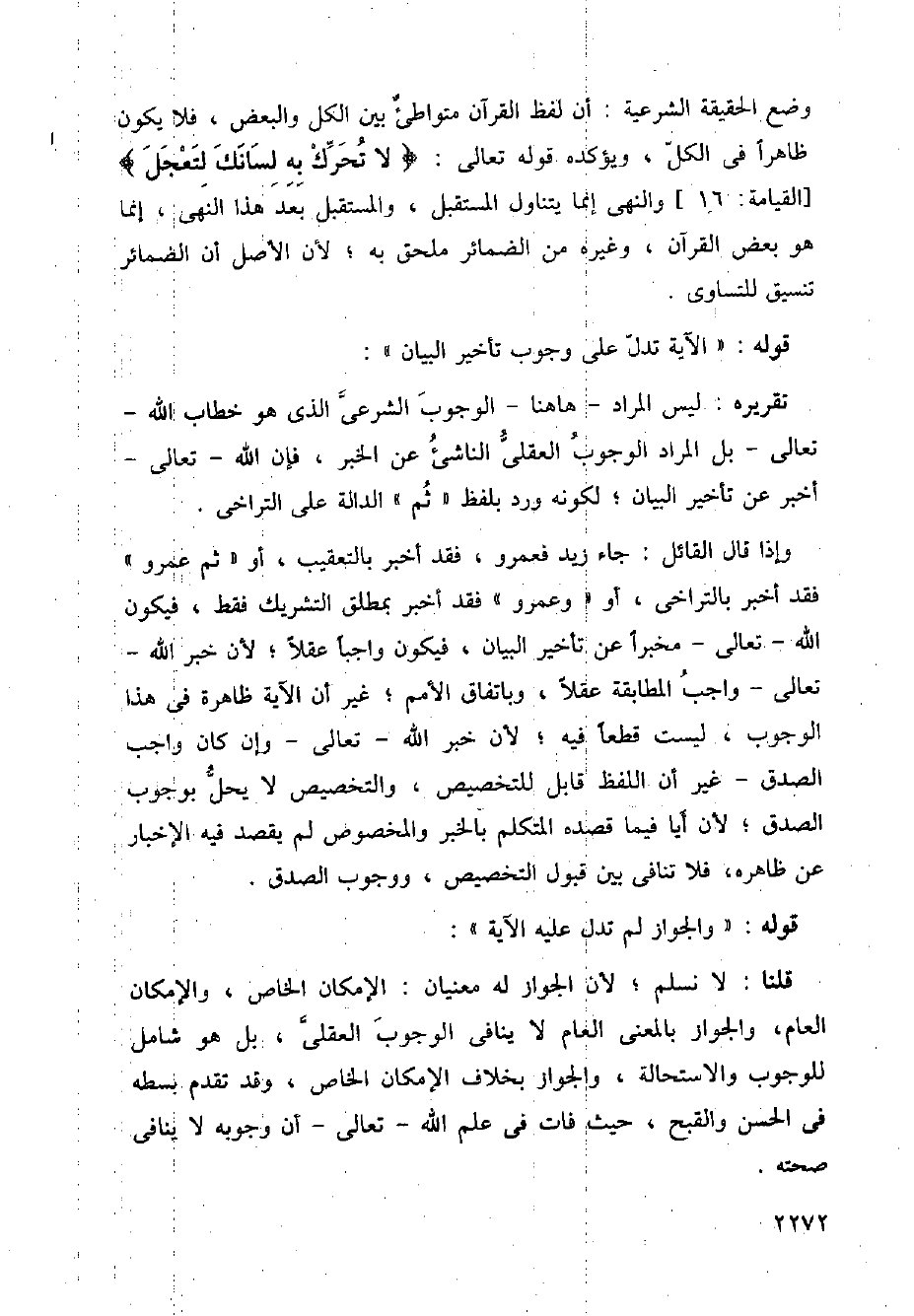 تقريره: ليس المراد - هاهنا - الوجوب الشرعي الذي هو خطاب الله - تعالى - بل المراد الوجوب العقلي الناشيء عن الخبر، فإن الله - تعالى - أخبر عن تأخير البيان؛ لكونه ورد بلفظ (ثم) الدالة على التراخي.