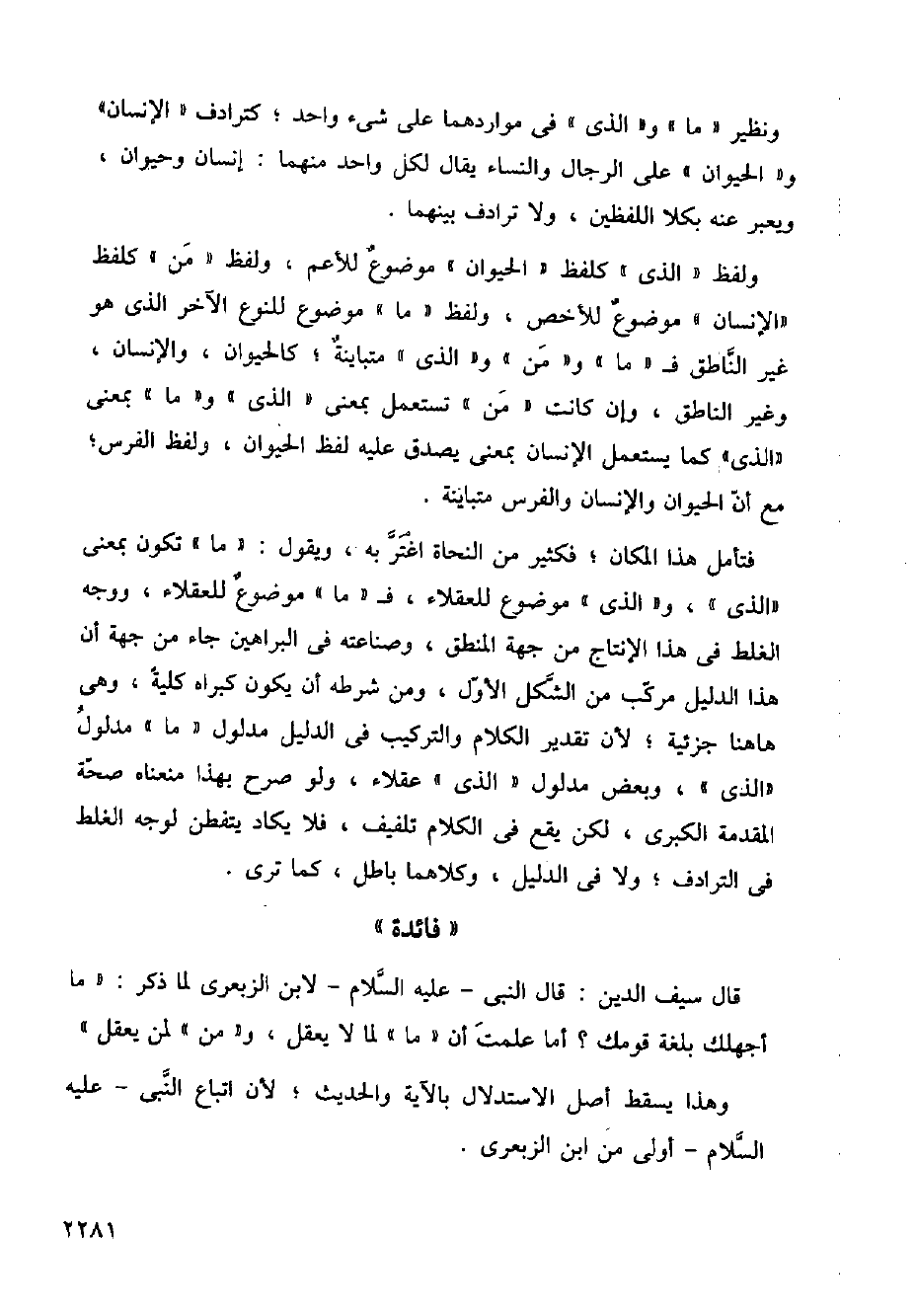 فتأمل هذا المكان؛ فكثير من النحاة اغتر به، ويقول: (ما) تكون بمعنى (الذي)، و (الذي) موضوع للعقلاء، فـ (ما) موضوع للعقلاء، ووجه الغلط في هذا الإنتاج من جهة المنطق، وصناعته في البراهين جاء من جهة أن هذا الدليل مركب من الشكل الأول، ومن شرطه أن يكون كبراه كلية، وهي هاهنا جزئية؛ لأن تقدير الكلام والتركيب في الدليل مدلول (ما) مدلول (الذي)، وبعض مدلول (الذي) عقلاء، ولو صرح بهذا منعناه صحة المقدمة الكبرى، لكن يقع في الكلام تلفيف، فلا يكاد يتفطن لوجه الغلط في الترادف؛ ولا في الدليل، وكلاهما باطل، كما ترى.