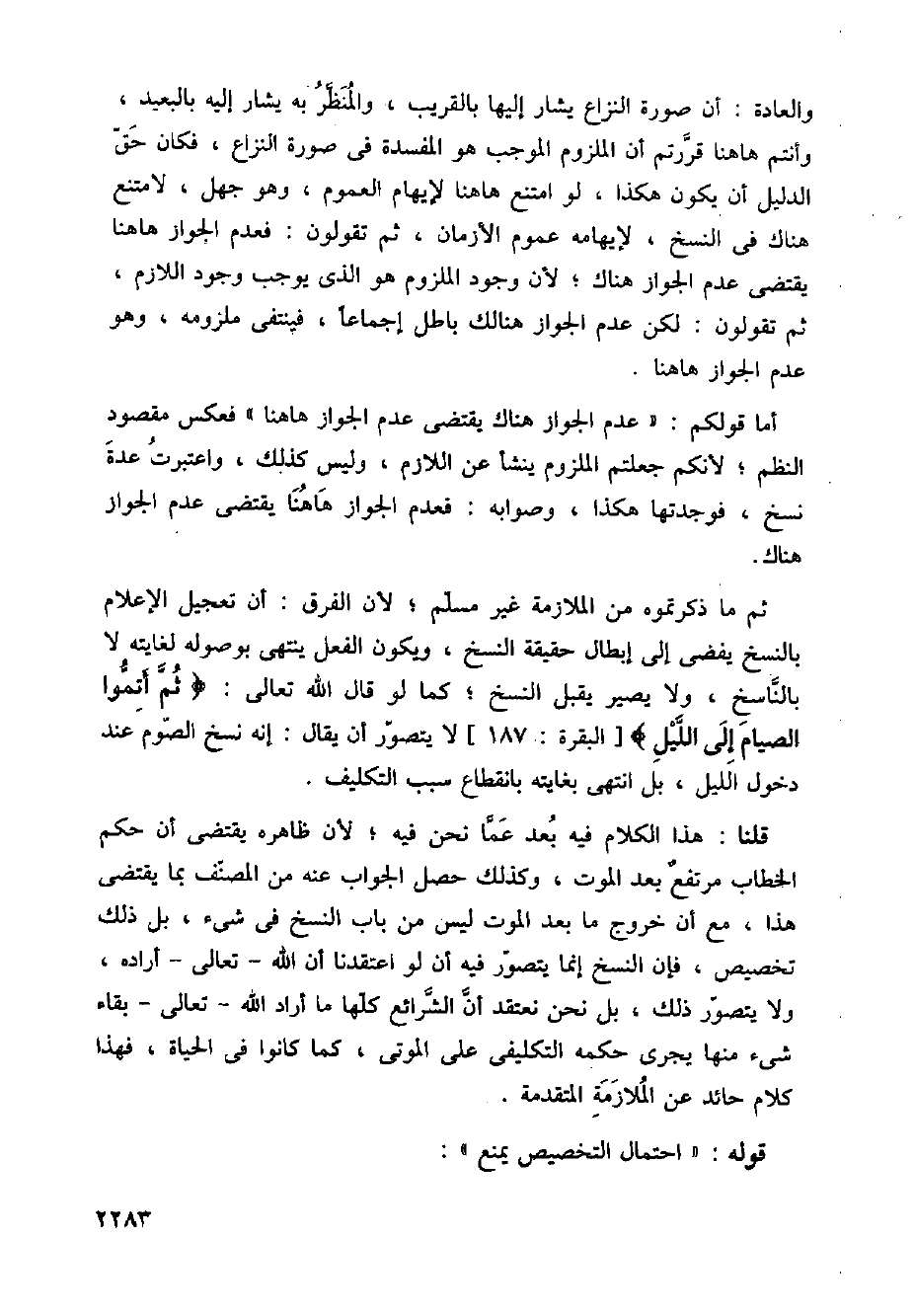 ثم ما ذكرتموه من الملازمة غير مسلم؛ لأن الفرق: أن تعجيل الإعلام بالنسخ يفضي إلى إبطال حقيقة النسخ، ويكون الفعل ينتهي بوصوله لغايته لا بالناسخ، ولا يصير يقبل النسخ؛ كما لو قال الله تعالى: {ثم أتموا الصيام إلى الليل} [البقرة: 187] لا يتصور أن يقال: إنه نسخ الصوم عند دخول الليل، بل انتهى بغايته بانقطاع سبب التكليف.