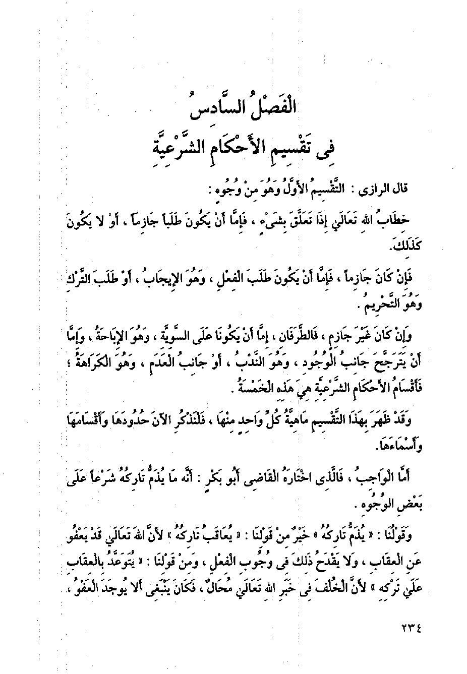 وإن كان غير جازم، فالطرفان، إما أن يكونا على السوية، وهو الإباحة، وإما أن يترجح جانب الوجود، وهو الندب، أو جانب العدم، وهو الكراهة، فأقسام الأحكام الشرعية هي هذه الخمسة.