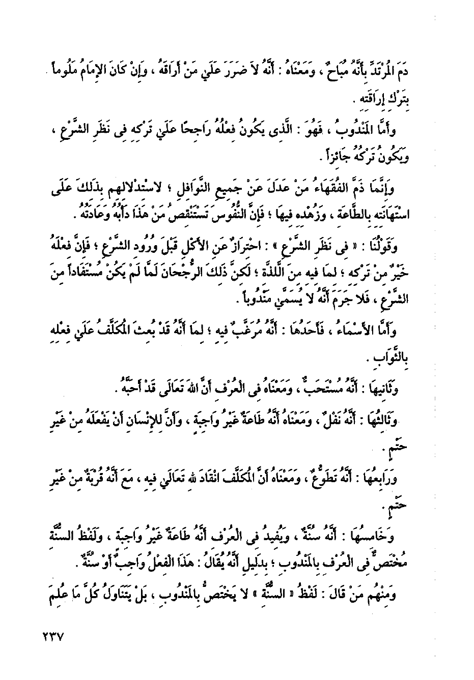 وخامسها: أنه سنة، ويفيد في العرف أنه طاعة غير واجبة، ولفظ السنة مختص في العرف بالمندوب بدليل أنه يقال هذا الفعل واجب أو سنة.