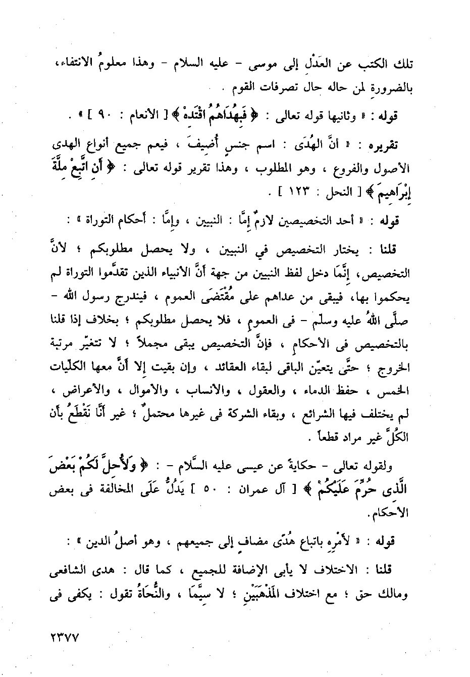 قلنا: يختار التخصيص في النبيين، ولا يحصل مطلوبكم؛ لأن التخصيص، إنما دخل لفظ النبيين من جهة أن الأنبياء الذين تقدموا التوراة لم يحكموا بها، فيبقى من عداهم على مقتضى العمم، فيندرج رسول الله صلى الله عليه وسلم في العموم، فلا يحصل مطلوبكم؛ بخلاف إذا قلنا بالتخصيص في الأحكام، فإن التخصيص يبقى مجملا؛ لا تتغير مرتبة الخروج؛ حتى يتعين الباقي لبقاء العقائد، وغن بقيت غلا ان معها الكليات الخمس، حفظ الدماء، والعقول، والأنساب، والأموال، والأعراض، لم يختلف فيها الشرائع، وبقاء الشركة في غيرها محتمل؛ غير أنا نقطع بأن الكل غير مراد قطعا.