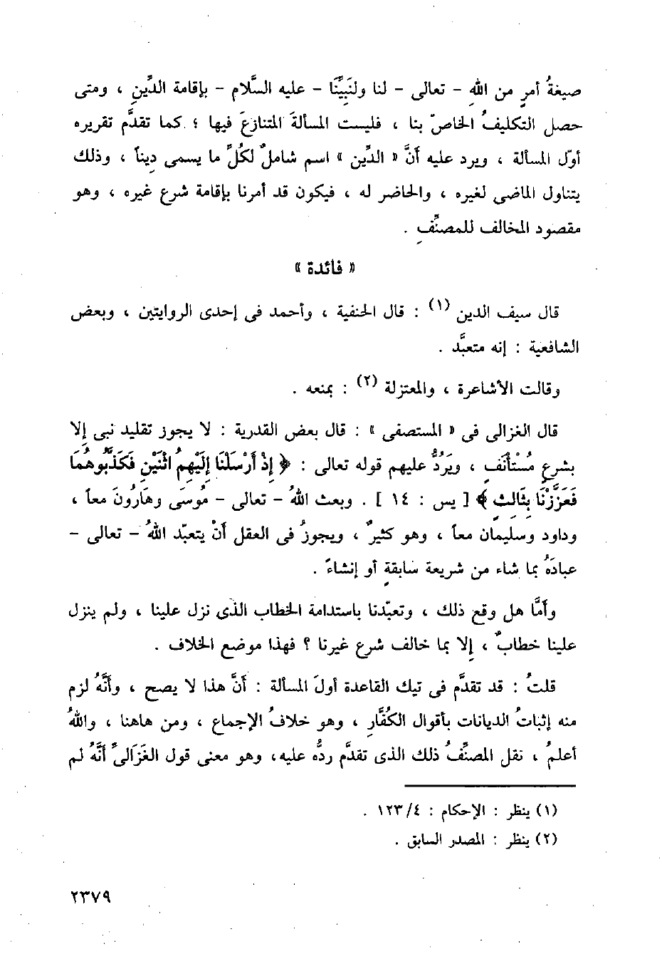 قال الغزالي في (المستصفى): قال بعض القدرية: لا يجوز تقليد نبي إلا بشرع مستأنف، ويرد عليهم قوله تعالى: {إذ أرسلنا إليهم اثنين فكذبوهما فعززنا بثالث} [يس: 14]. وبعث الله تعالى موسى وهارون معا، داود وسليمان معا، وهو كثير، ويجوز في العقل أن يتعبد الله تعالى عباده بما شاء من شريعة سابقة أو إنشاء.