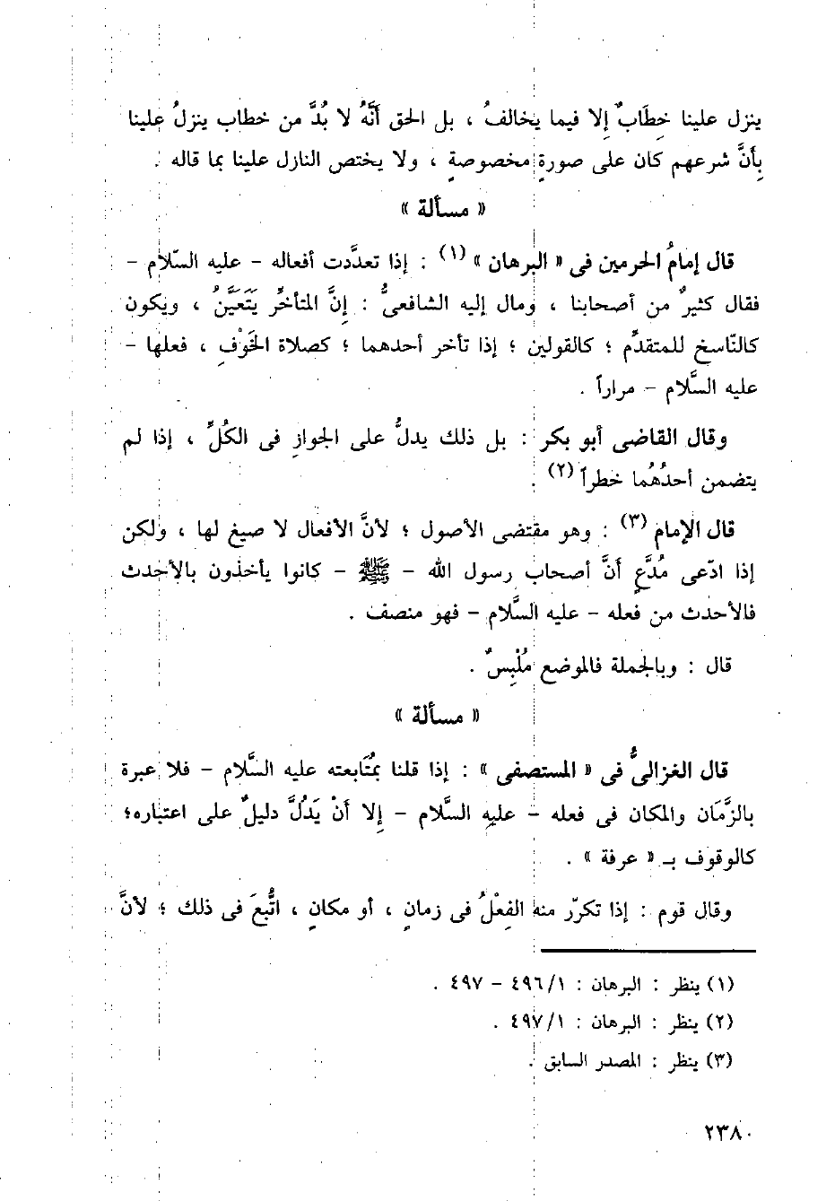 قال إمام الحرمين في (البرهان): إذا تعددت أفعاله عليه السلام فقال كثير من أصحابنا، ومال إليه الشافعي: إن المتأخر يتعين، ويكون كالناسخ للمتقدم؛ كالقولين؛ إذا تأخر أحدهما؛ كصلاة الخوف، فعلها عليه السلام مرارا.