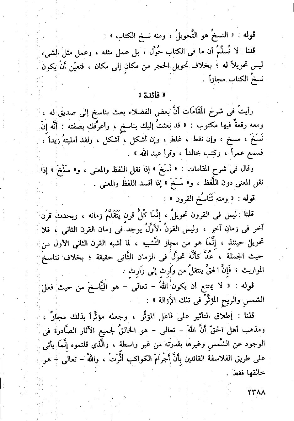 وقال في شرح المقامات: " نسخ " إذا نقل اللفظ والمعنى، و " سلخ " إذا نقل المعنى دون اللفظ، و" مسخ " إذا افسد اللفظ والمعنى. قوله: " ومنه تناسخ القرون ".