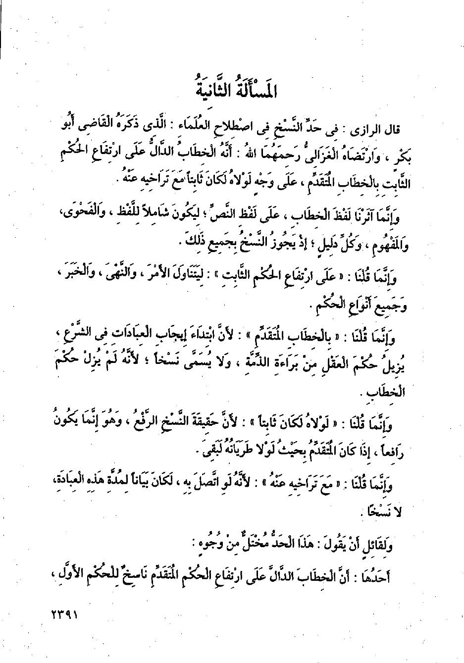 قال الرازي: في حد النسخ في اصطلاح العلماء: الذي ذكره القاضي أبو بكر، وارتضاه الغزالي رحمهما الله: أنه الخطاب الدال على ارتفاع الحكم الثابت بالخطاب المتقدم، على وجه لولاه لكان ثابتا مع تراخيه عنه.