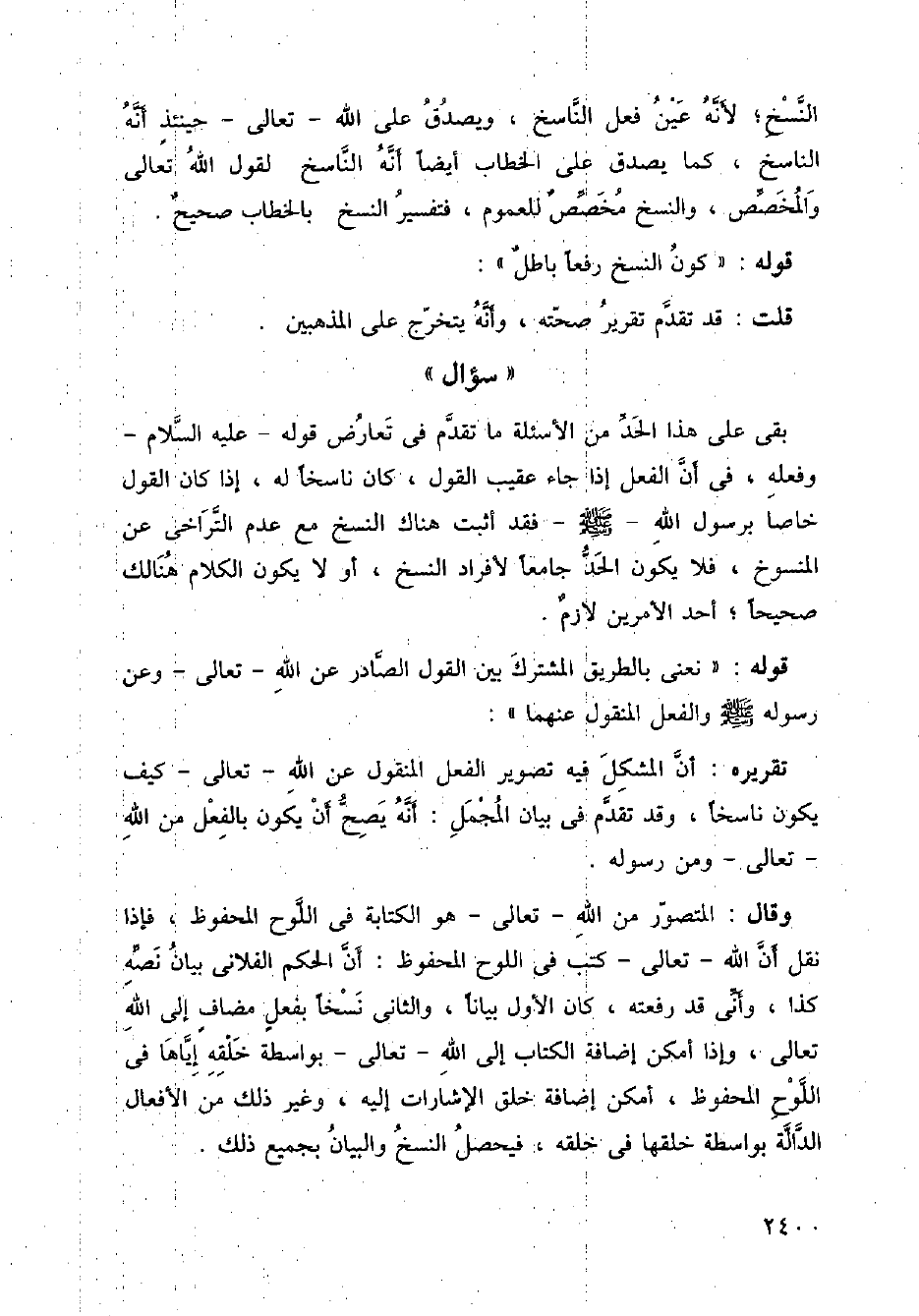 بقى على هذا الحد من الأسئلة ما تقدم في تعارض قوله عليه السلام وفعله، في أن الفعل إذا جاء عقيب القول، كان ناسخا له، إذا كان القول خاصا برسول الله صلى الله عليه وسلم فقد أثبت هناك النسخ مع عدم التراخي عن المنسوخ، فلا يكون الحد جامعا لأفراد النسخ، أو لا يكون الكلام هنالك صحيحا؛ أحد الأمرين لازم.