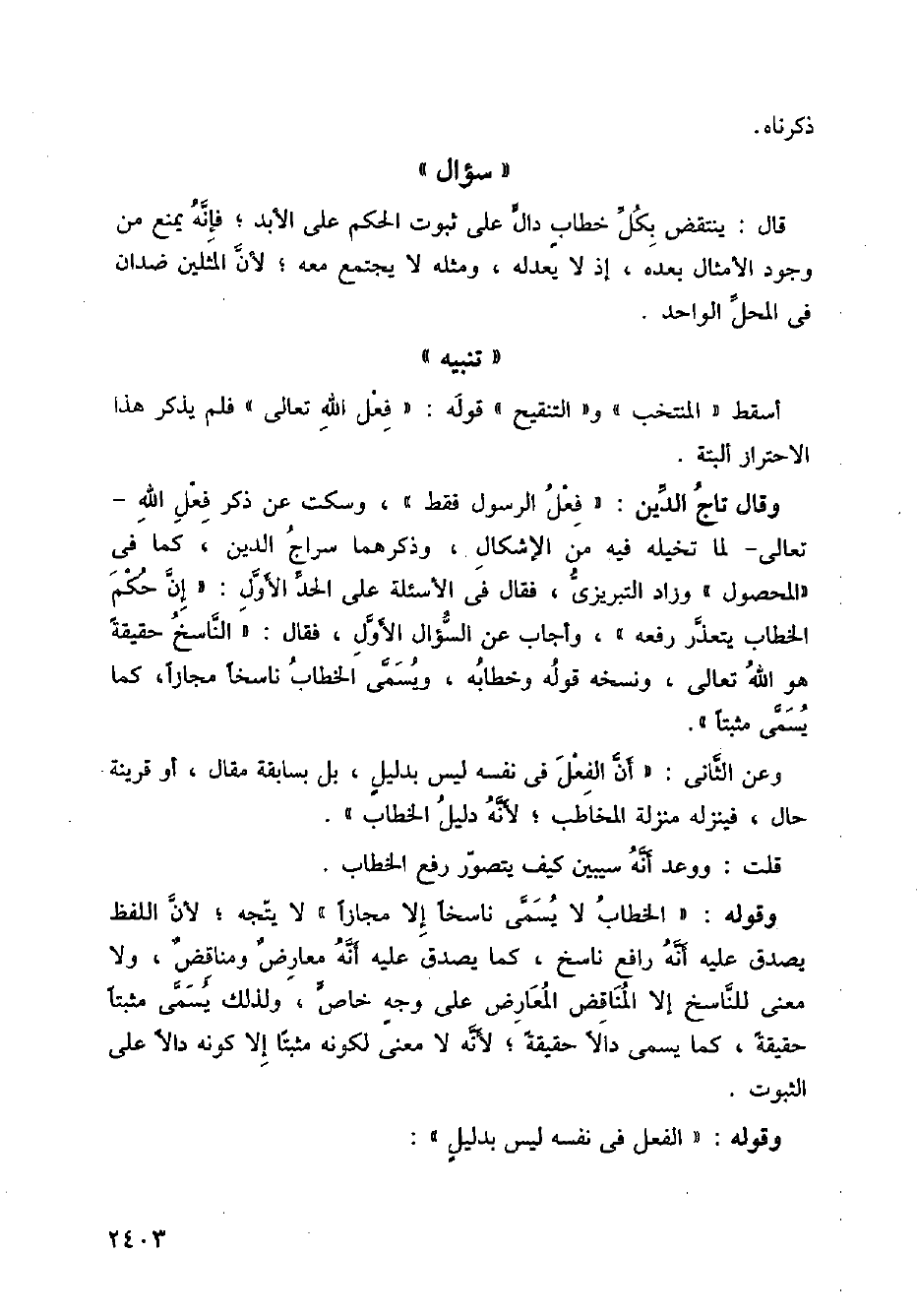 وقال تاج الدين:" فعل الرسول فقط "، وسكت عن ذكر فعل الله تعالى لما تخيله فيه من الإشكال، وذكرهما سراج الدين، كما في " المحصول " وزاد التبريزي، فقال في الأسئلة على الحد الأول:" إن حكم الخطاب يتعذر رفعه "، وأجاب عن السؤال الأول، فقال: " الناسخ حقيقة هو الله تعالى، ونسخه قوله وخطابه، ويسمى الخطاب ناسخا مجازا، كما يسمى مثبتا ".