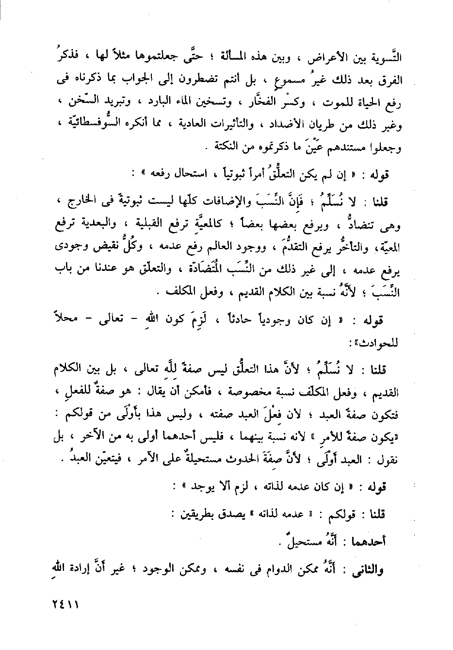 قلنا: لا نسلم؛ فإن النسب والإضافات كلها ليست ثبوتية في الخارج، وهي تتضاد، ويرفع بعضها بعضا؛ كالمعية ترفع القبلية، والبعدية ترفع المعية، والتأخير يرفع التقدم، ووجود العالم رفع عدمه، وكل نقيض وجودي يرفع عدمه، غلى غير ذلك من النسب المتضادة، والتعلق هو عندنا من باب النسب؛ لأنه نسبة بين الكلام القديم، وفعل المكلف.