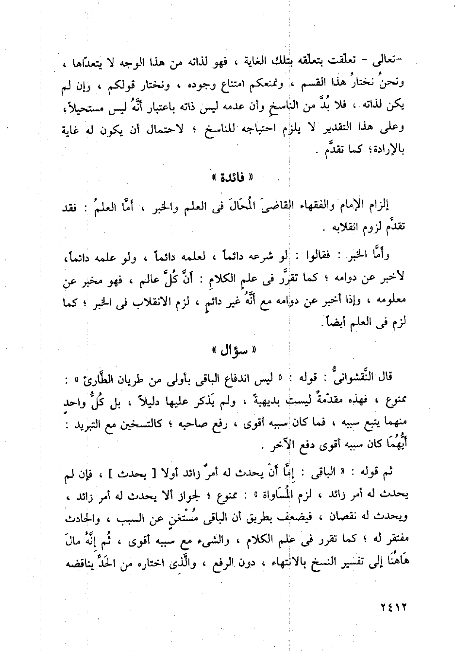 تعالى تعلقت بتعلقه بتلك الغاية، فهو لذاته من هذا الوجه لا يتعداها، ونحن نختار هذا القسم، ونمنعكم امتناع وجوده، ونختار قولكم، وإن لم يكن لذاته، فلا بد من الناسخ وأن عدمه ليس ذاته باعتبار أنه ليس مستحيلا، وعلى هذا التقدير لا يلزم احتياجه للناسخ؛ لاحتمال أن يكون له غاية بالإرادة؛ كما تقدم.