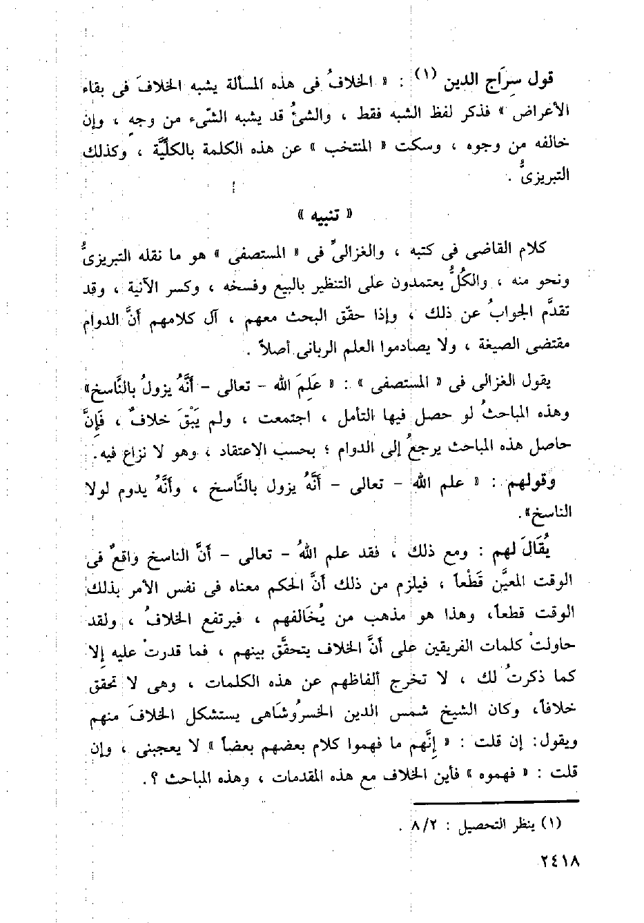 قول سراج الدين: " الخلاف في هذه المسالة يشبه الخلاف في بقاء الاعراض " فذكر لفظ الشبه فقط، والشيء قد يشبه الشيء من وجه، وإن خالفه من وجوه، وسكت " المنتخب " عن هذه الكلمة بالكلية، وكذلك التبريزي.