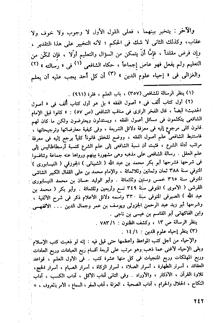 والآخر: يتخير بينهما، فعلى القول الأول لا وجوب ولا خوف ولا عقاب، وكذلك الثاني لا شك في الحكم؛ لأنه التخيير على هذا التقدير، وإن فرض مقلدا، فإما أن يتمكن من السؤال والتعليم أولا، فإن تمكن من التعليم ولم يفعل فهو عاص إجماعا، حكاه الشافعي في ((رسالته)) والغزالي في ((إحياء علوم الدين)) أن كل أحد يجب عليه أن يعلم