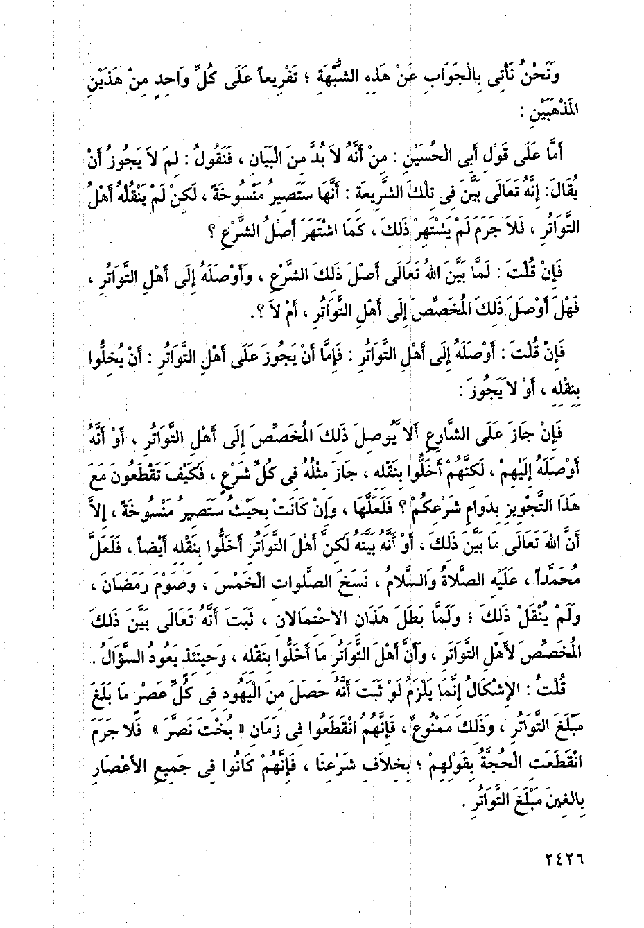 فإن جاز على الشارع الا يوصل ذلك المخصص إلى أ÷ل التواتر، أو انه اوصله اليهم، لكنهم أخلوا بنقله، جاز مثله في كل شرع، فكيف تقطعون مع هذا التجويز بدوام شرعكم؟ فلعلها، وإن كانت بحيث ستصير منسوخة، إلا أن الله تعالى ما بين ذلك، أو انه بينه لكن أهل التواتر أخلوا بنقله أيضا، فلعل محمدا، عليه الصلاة والسلام، نسخ الصلوات الخمس، وصوم رمضان، ولم ينقل ذلك؛ ولما بطل هذان الاحتمالان، ثبت أنه تعالى بين ذلك المخصص لأهل التواتر، وأن أهل التواتر ما أخلوا بنقله، وحينئذ يعود السؤال.