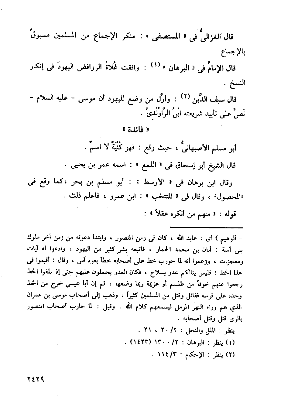 قال سيف الدين: وأول من وضع لليهود أن موسى عليه السلام نص على تأبيد شريعته ابن الراوندي.