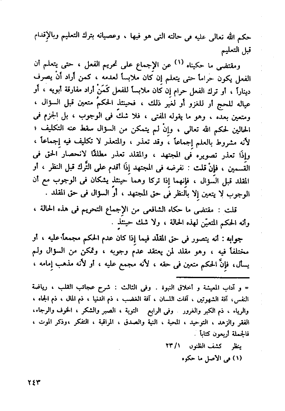 ومقتضى ما حكيناه عن الإجماع على تحريم الفعل، حتى يتعلم أن الفعل يكون حراما حتى يتعلم إن كان ملابسا لعدمه، كمن أراد أن يصرف دينارا، أو ترك الفعل حرام إن كان ملابسا للفعل كمن أراد مفارقة أبويه، أو عياله للحج أو للغزو أو لغير ذلك، فحينئذ الحكم متعين قبل السؤال، ومتعين بعده، وهو ما يقوله المفتى، فلا شك في الوجوب، بل الجزم في الحالين لحكم لله تعالى، وإن لم يتمكن من السؤال سقط عنه التكليف، لأنه مشروط بالعلم إجماعا، وقد تعذر، والمتعذر لا تكليف فيه إجماعا، وإذا تعذر تصويره في المجتهد، والمقلد تعذر مطلقا لانحصار الحق في القسمين، فإن قلت: نفرضه في المجتهد إذا أقدم على الترك قبل النظر، أو المقلد قبل السؤال، فإنهما إذا تركا وهما حينئذ يشكان في الوجوب مع أن الوجوب لا يتعين إلا بالنظر في حق المجتهد، أو السؤال في حق المقلد.