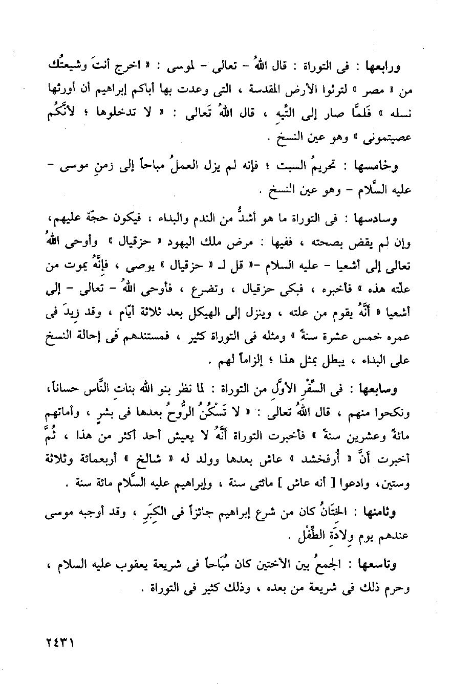 ورابعها: في التوراة: قال الله تعالى لموسى: " اخرج انت وشيعتك من (مصر) لترثوا الارض المقدسة، التي وعدت بها أباكم إبراهيم أن أورثها نسله " فلما صار إلى التيه، قال الله تعالى: " لا تدخلوها؛ لأنكم عصيتموني " وهو عين النسخ.