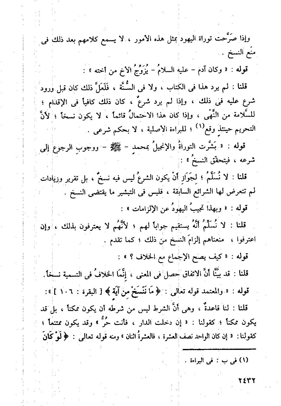 قلنا: لم يرد هذا في الكتاب، ولا في السنة، فلعل ذلك كان قبل ورد شرع عليه في ذلك، وإذا لم يرد شرع، كان ذلك كافيا في الاقدام؛ للسلامة من النهي، وإذا كان هذا الاحتمال قائما، لا يكون نسخا؛ لأن التحريم حينئذ وقع؛ للبراءة الأصلية، لا بحكم شرعي.