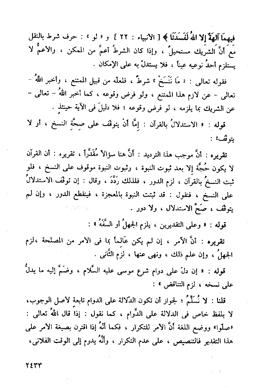 فيهما آلهة إلا لله لفسدتا} [الأنبياء: 22] و (لو): حرف شرط بالنقل مع ان الشريك مستحيل، واذا كان الشرط اعم من الممكن، والاعم لا يستلزم أحد نوعيه عينا، فلا يستدل به على الإمكان.
