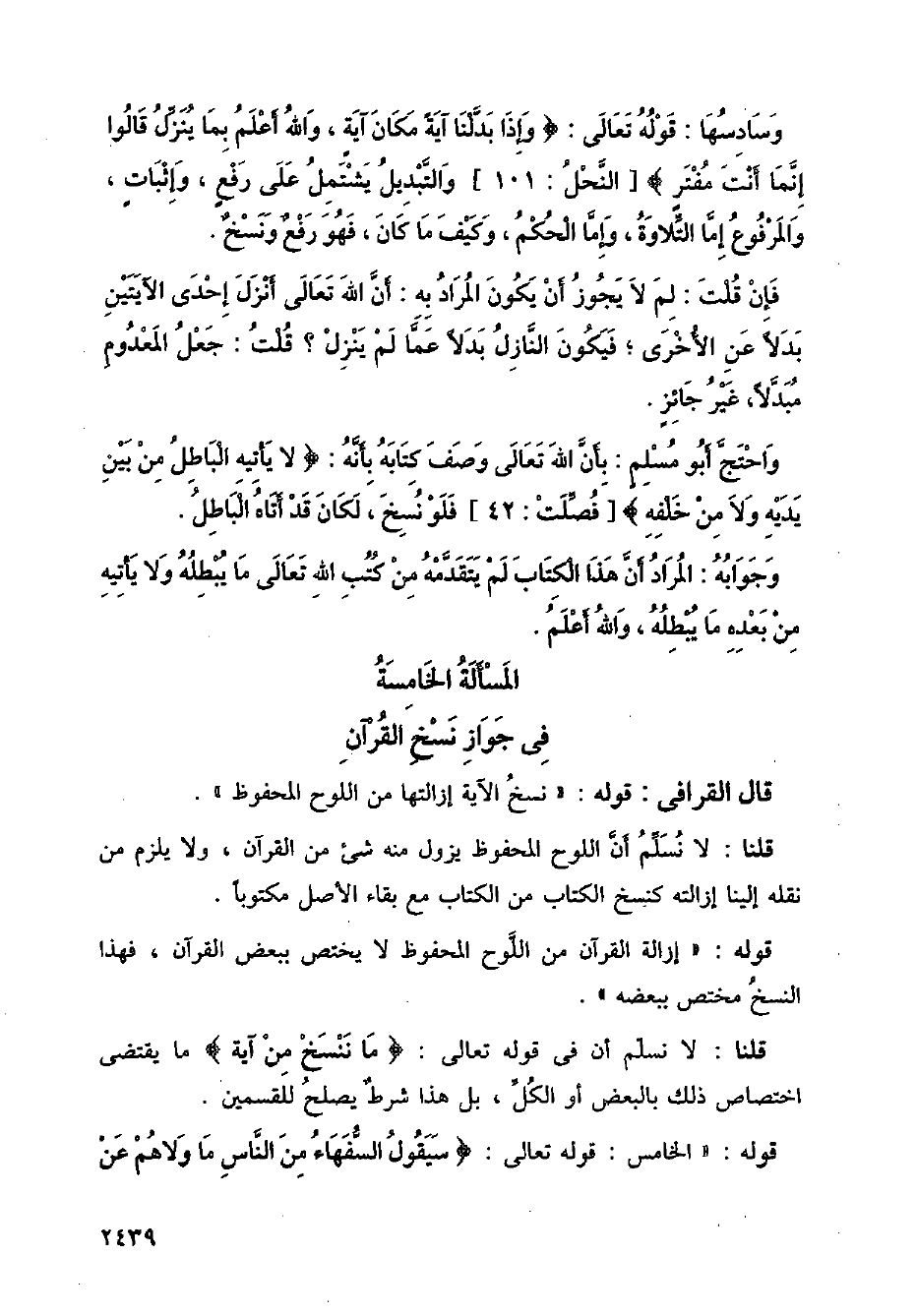 قال القرافي: قوله: " نسخ الآية إزالتها من اللوح المحفوظ ".