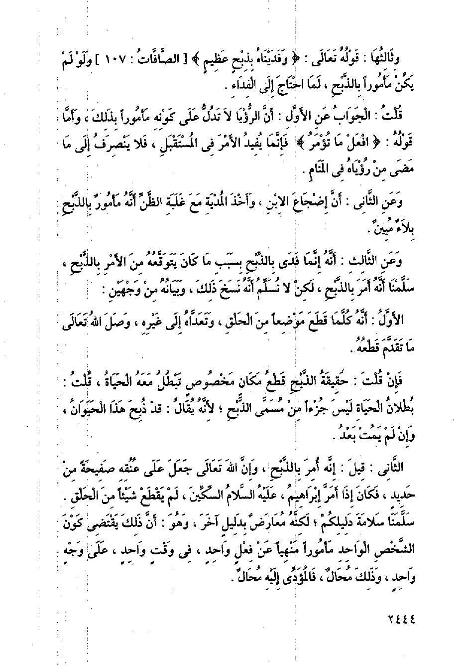 وثالثها: قوله تعالى: {وفديناه بذبح عظيم}] الصافات: 107 [، ولو لم يكن مأمورًا بالذبح، لما احتاج إلى الفداء.