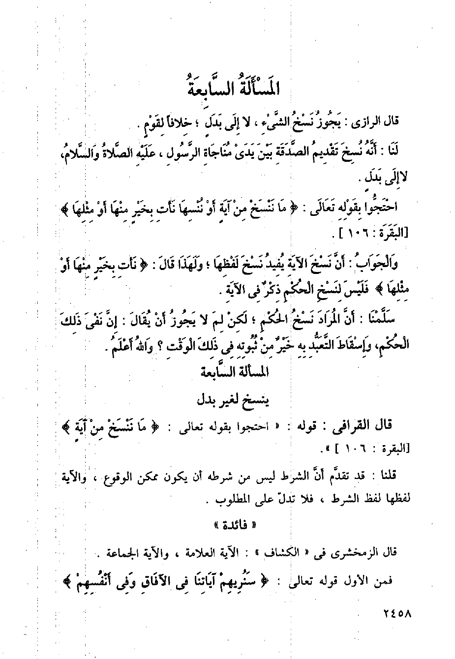 قال القرافي: قوله: "احتجوا بقول الله تعالى: {ما ننسخ من آية}] البقرة: 106 [".