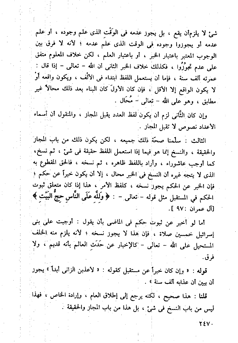 الثالث: سلمنا صحة ذلك جميعه، لكن يكون ذلك من باب المجاز والحقيقة، والنسخ إنما هو فيما إذا استعمل اللفظ حقيقة في شيء، ثم نسخ، كما أوجب عاشوراء، وأراد باللفظ ظاهره، ثم نسخه، فالحق المقطوع به الذي لا يتجه غيره أن النسخ في الخبر محال، إلا أن يكون خبرًا عن حكم؛ فإن الخبر عن الحكم يجوز نسخه، كلفظ الأمر، هذا إذا كان متعلق ثبوت الحكم في المستقبل مثل قوله تعالى: {ولله على الناس حج البيت} [آل عمران: 97].