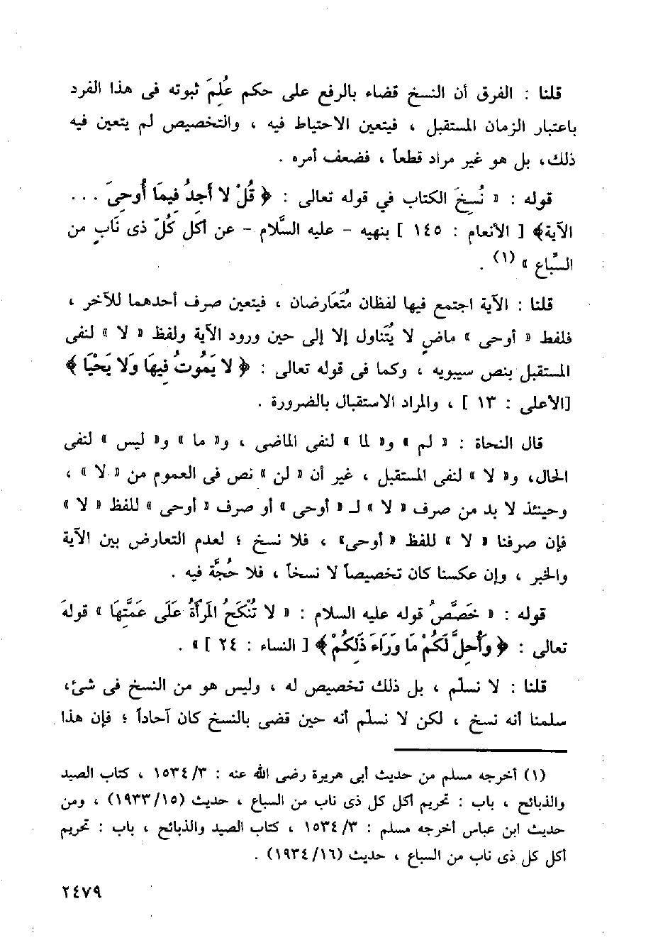 قال النحاة: (لم) و (لما) لنفي الماضي، و (ما) و (ليس) لنفي الحال، و (لا) لنفي المستقبل، غير أن (لن) نص في العموم من (لا)، وحينئذ لا بد من صرف (لا) لـ (أوحي) أو صرف (أوحي) للفظ (لا) فإن صرفنا (لا) للفظ (أوحي)، فلا نسخ؛ لعدم التعارض بين الآية والخبر، وإن عكسنا كان تخصيصًا لا نسخًا، فلا حجة فيه.