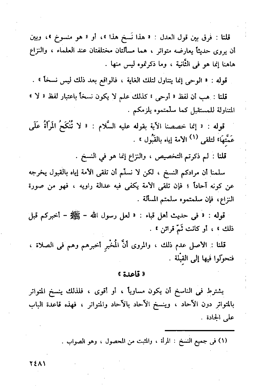 قلنا: فرق بين قول العدل: "هذا نسخ هذا" أو "هو منسوخ"، وبين أن يروي حديثًا يعارضه متواتر، هما مسألتان مختلفتان عند العلماء، والنزاع هاهنا إنما هو في الثانية، وما ذكرتموه ليس منها.