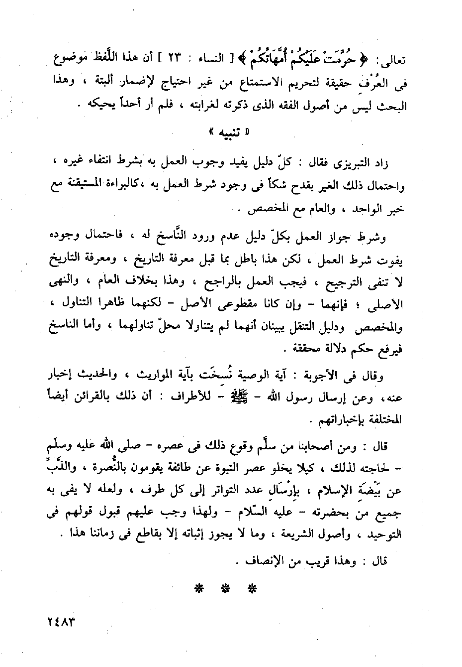 تعالى: {حرمت عليكم أمهاتكم} [النساء: 23] أن هذا اللفظ موضوع في العرف حقيقة لتحريم الاستمتاع من غير احتياج لإضمار البتة، وهذا البحث ليس من أصول الفقه الذي ذكرته لغرابته، فلم أر أحدًا يحيكه.